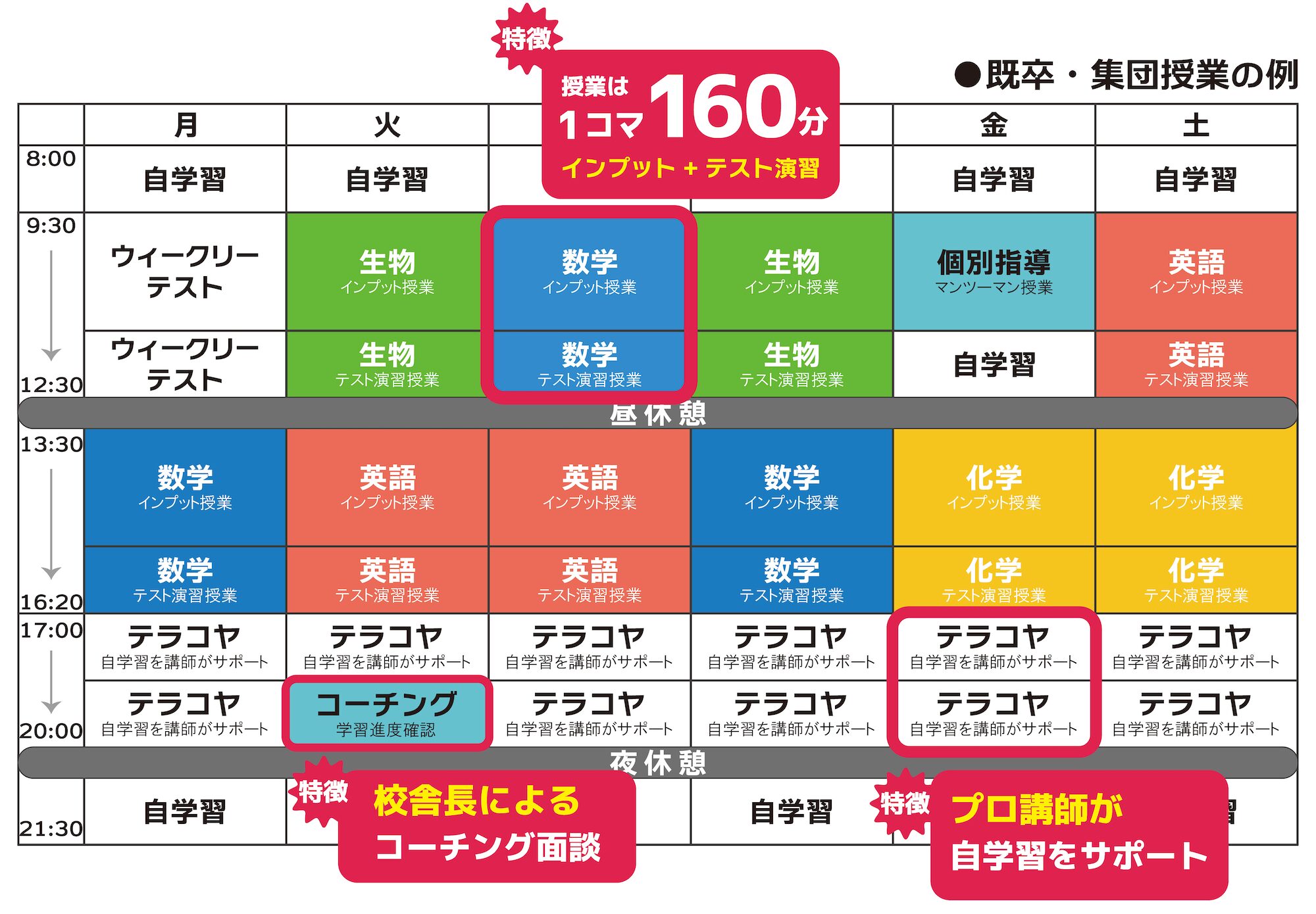授業は1コマ160分(集団授業100分+演習授業60分)を1コマとし、夕方のテラコヤ授業と合わせることで 1日当たり12時間の学習時間を確保しています。