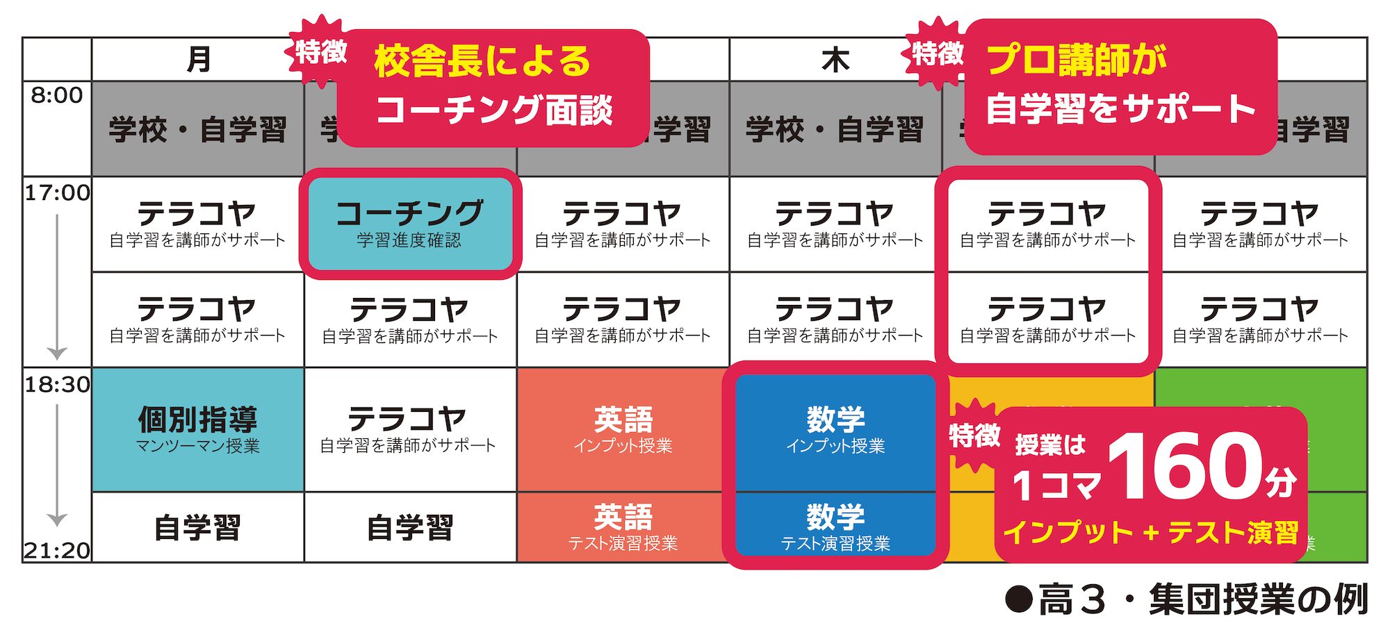 授業は1コマ160分(集団授業100分+演習授業60分)を1コマとし、テラコヤ授業で自学習を講師がサポートします。